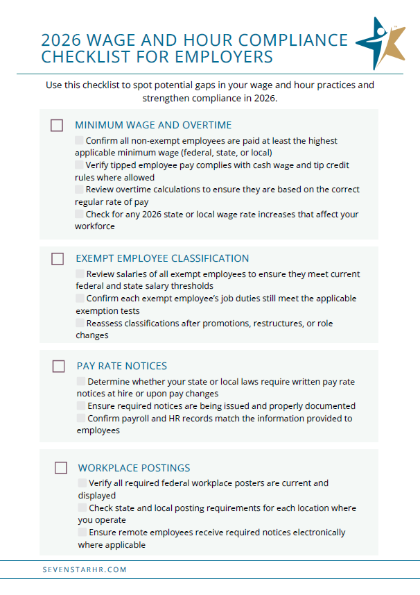 To make this easier, we’ve created a free, printable Wage and Hour Compliance Checklist that walks you through each of these risk areas step by step.
